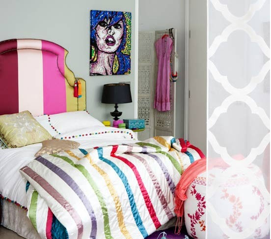 仿佛是打開的薰衣草一般的夢(mèng)幻淡紫撲面而來,那樣清淺的顏色糅合了紫色的沉郁和白色的 純粹,再搭配精致的粉色,更添一種浪漫風(fēng)情,斑斕的碎花床罩,突出的是一種自然詩意朦朧,明快的藤黃更是帶來了一種春一般的溫暖感覺。